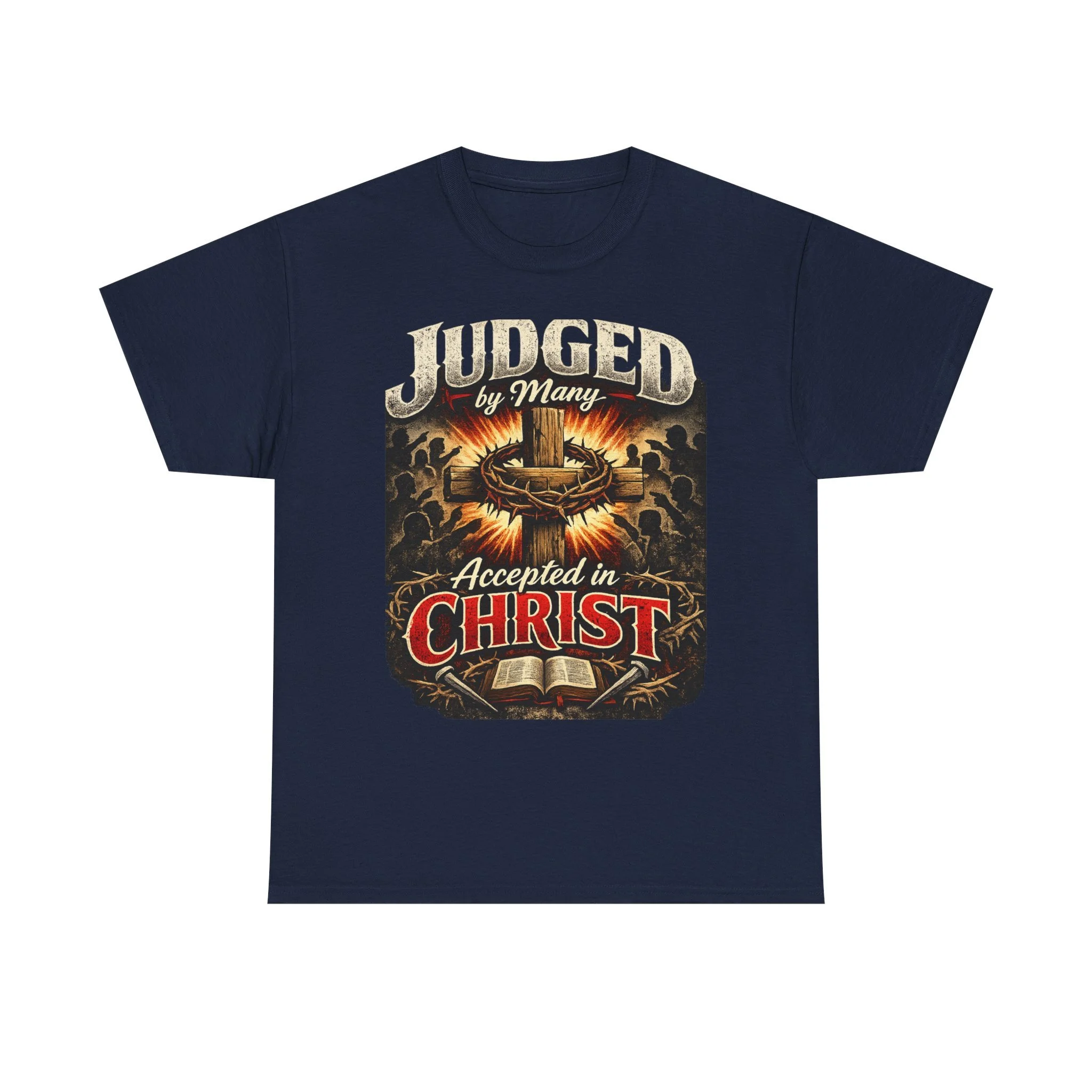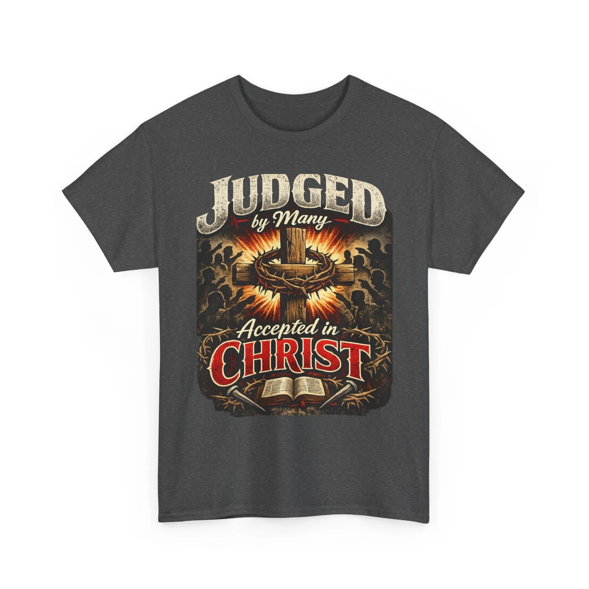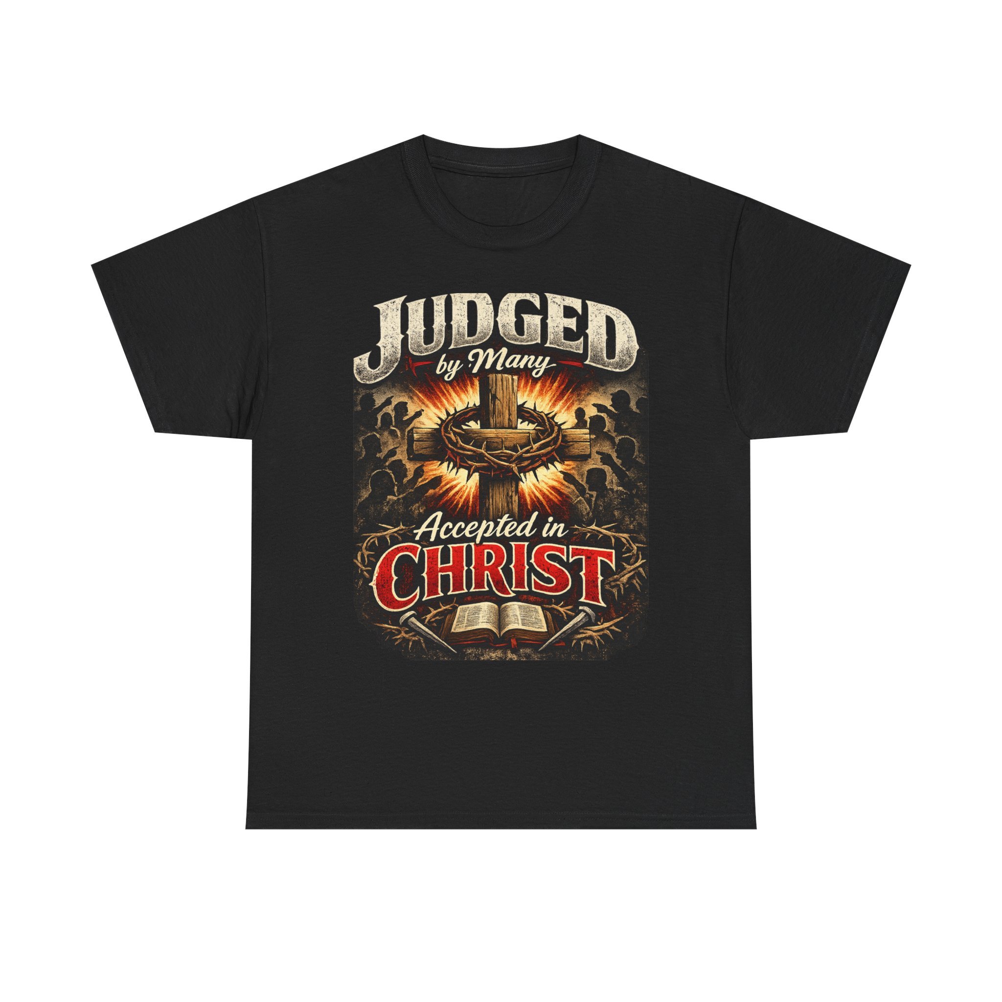 A bold, faith-forward tee that wears like a quiet testimony. Dark, durable cotton forms the stage for a vintage-inspired graphic: a crown of thorns, an open Bible, and the declaration “Judged by Many — Accepted in Christ.” The print’s distressed tones and warm highlights give it an aged, almost hymnbook feel — tough enough for everyday wear, reverent enough to start conversations at church events or small-group meetups. Wear it with jeans, under a flannel, or layered for cooler evenings — it sits comfortably in the background while the message takes center stage.