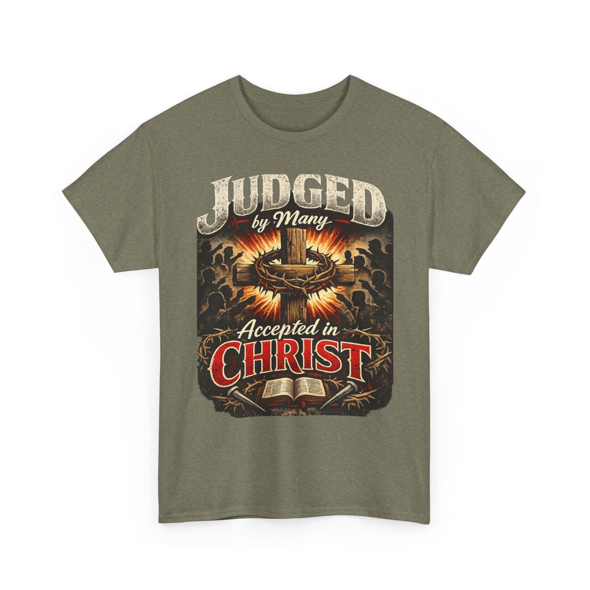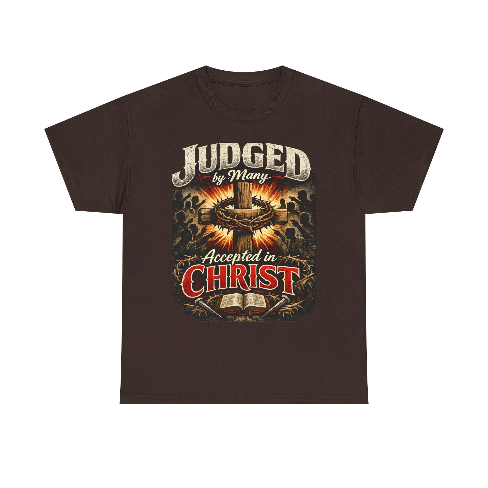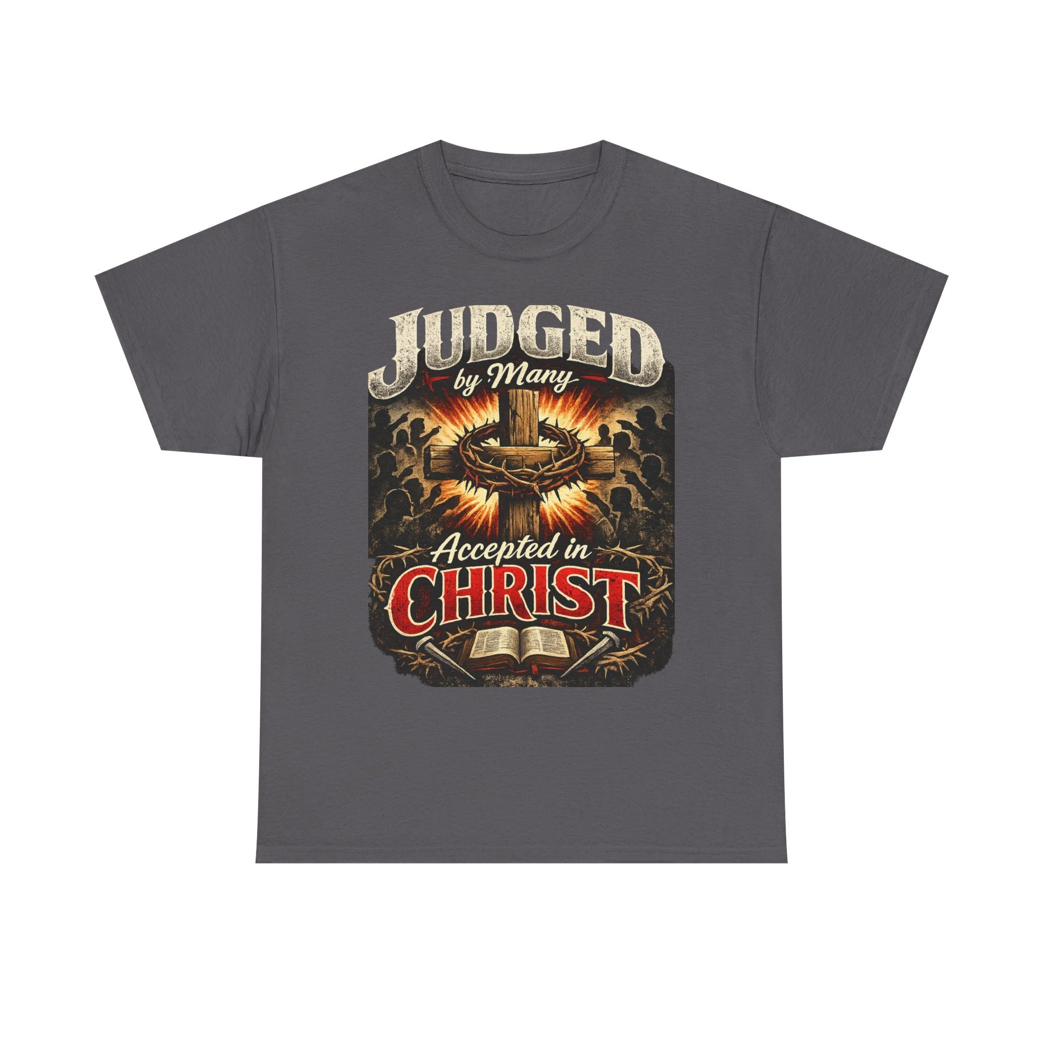 A bold, faith-forward tee that wears like a quiet testimony. Dark, durable cotton forms the stage for a vintage-inspired graphic: a crown of thorns, an open Bible, and the declaration “Judged by Many — Accepted in Christ.” The print’s distressed tones and warm highlights give it an aged, almost hymnbook feel — tough enough for everyday wear, reverent enough to start conversations at church events or small-group meetups. Wear it with jeans, under a flannel, or layered for cooler evenings — it sits comfortably in the background while the message takes center stage.